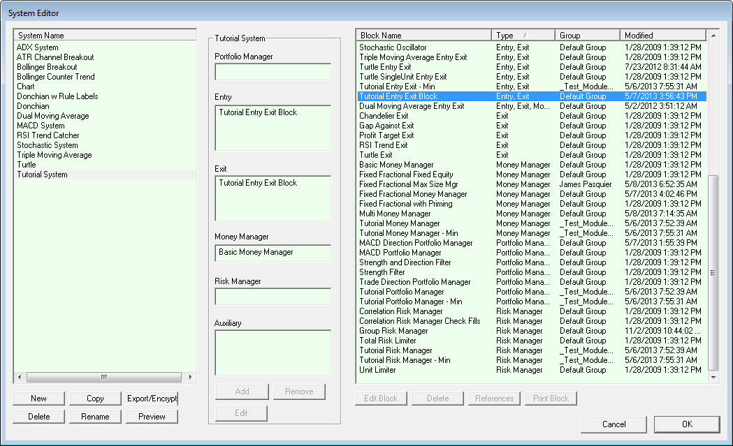 A Trading Blox system is a group of selected Blox modules that are available in the System Editor's module list. Each trader who builds their own system structure selects the specific modules they need to achieve the system's intended goal.