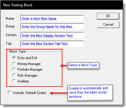 •The Block Type area determines the show five different block types that determine which script sections will appear in the block by default.