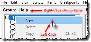 Clicking on the Blox tab that is on the top Menu, or Right-Click the mouse on the Group Section-Name where the block will be stored.