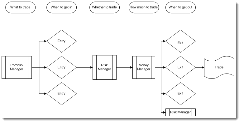 Starting with the entire portfolio of available markets, the Portfolio Manager Block filters those markets to determine which ones are available for trading on a given day, the Entry Blox create entry orders when the systems entry conditions have been met. Once an entry order has been created, the Risk Manager Block determines whether or not a particular order should be taken by assessing its affect on overall risk. If the Risk Manager Block determines the trade should be taken, the Money Manager Block looks at entry risk and other market factors to determine the size of the order (i.e. number of shares or contracts).