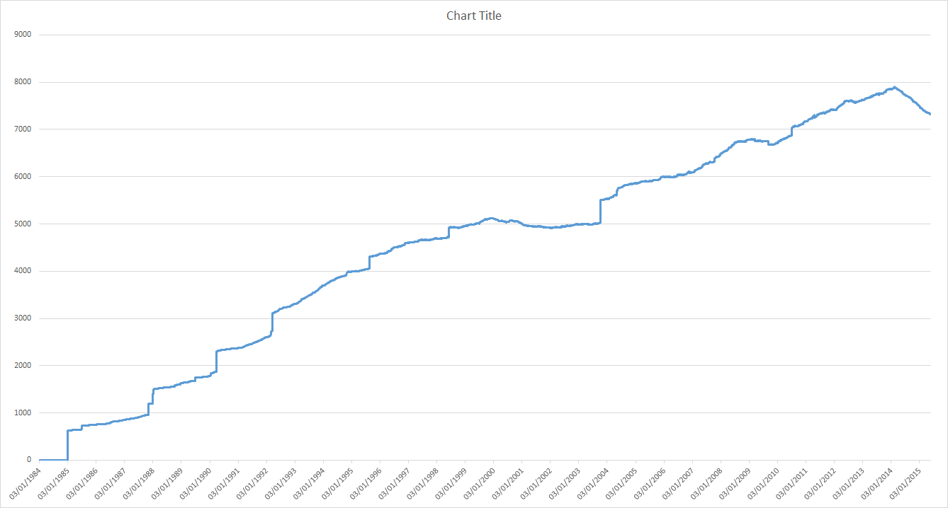 So, here is what I did. I queried the CSI sdbfacts.csv file and extracted the 14,000 listed US stocks on NYSE, NASDAQ and AMEX which had a trading history of over 1 year. You can see below how many instruments this consists of on a time series basis (obviously the stocks had different start and end date since they included de-listed stocks and of course stocks coming to the market over the years). Note that the current total of around 8,000 instruments greatly exceeds the number of companies listed on US markets (around 5,500 including foreign stocks) and this is because different share classes as well as preference shares and so forth are included. No matter.