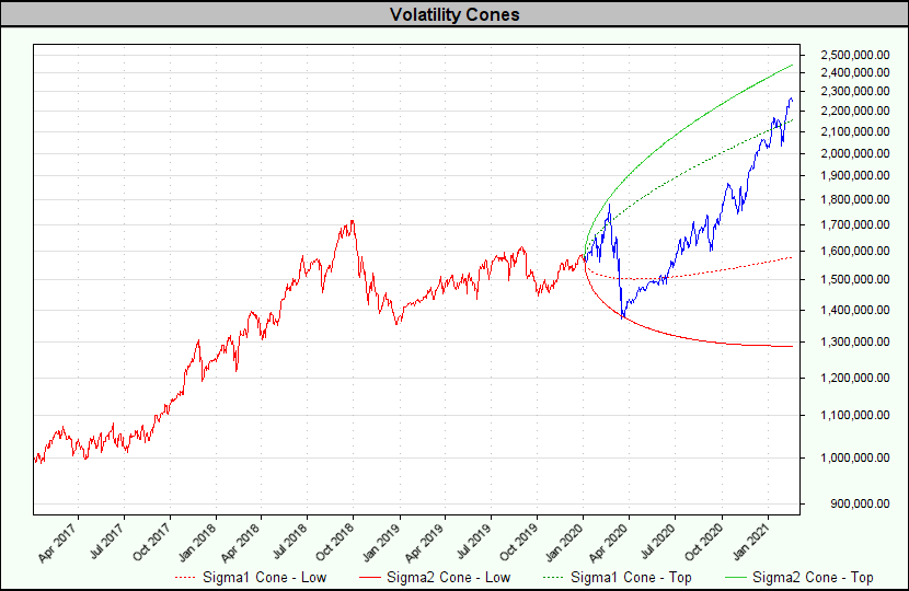 The Cones illustrate the upper and lower probability bands based on a given Mean and Standard deviation of Daily Equity returns assuming returns are Normal Distributed.