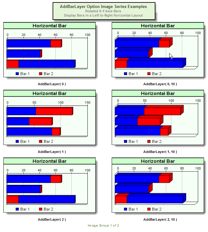 This method is not required with bar charts, but when it is used the first parameter provides five methods that change the way bar are displayed on a chart. Its second parameter provides control over the chart's 3-dimensional appearance. Applying a bar display modification doesn't require the user to change the 3D effect of the chart, but both parameters can be applied at the same time.