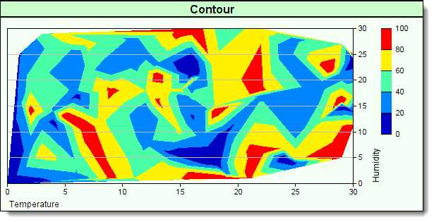 Contour maps display the X-Axis scale below the plotting areas lower chart boundary. Y-Axis scale is displayed just outside the plot areas right side boundary. Z-Axis scale steps are displayed in the area between the outside boundary Y-Axis scale. White space on the right side of a contour chart needs to provide enough pixel space to enable the Z-Scale color legend to display so that it doesn't interfere with the Y-Scale display.