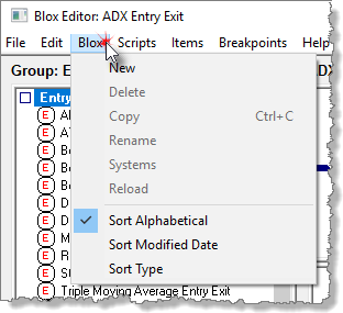 Information about the standard Blox Types is available in the Trading Blox Architecture table. The group is just used to group the blox in the listing on the left of the blox editor. There ability to group block in the list provides a flexibility for the user to organize the modules by block type, or system type, or dates, or customer/clients, etc.