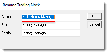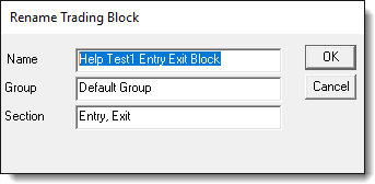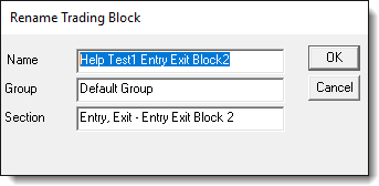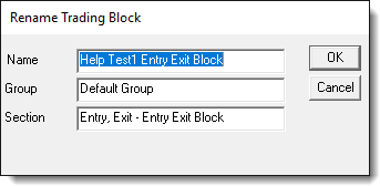 Block Group names can be changed using the Trading Blox Builder Blox Basic Editor's Blox Menu Rename option. It can also be changed using the Copy option to duplicate and change the name of a blox. When the Group name is changed, or when the mouse drags the block from its current group to a different group, Trading Blox Builder Blox Basic Editor will automatically change the the new Group name to the destination group name.