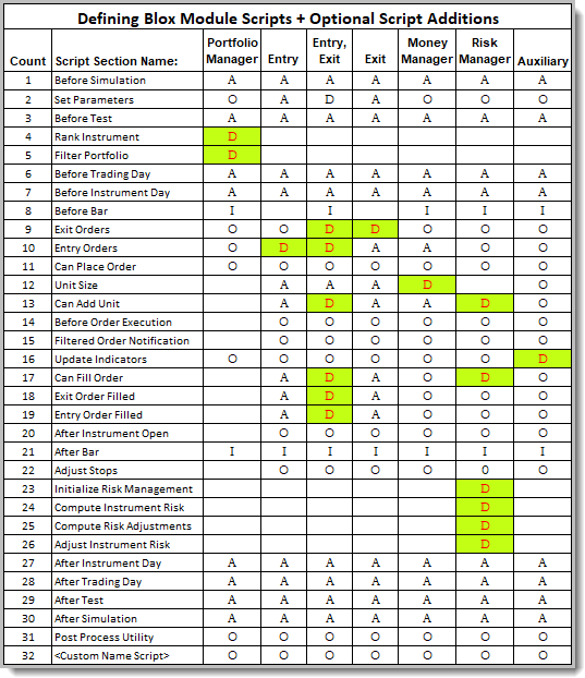 This next table shows the Trading Blox Builder script sections for each of block modules that might be needed in a system.