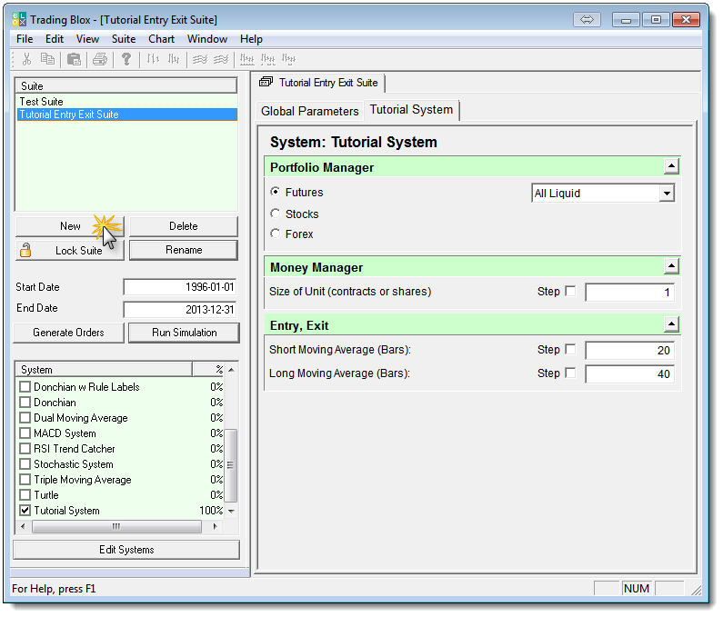 •To create a new Suite name to match our Tutorial Entry Exit System, click on the "New" button at bottom of the Suite listing in the upper right-hand area of the main screen: