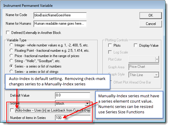 An Auto-Indexed series is sized and indexed to the test or instrument. A manually indexed series must have its size declared in the series creation dialog. It can then be managed and maintained when more or less series elements are required. All series elements are initialized to the value given in the series creation dialog. Manually-Indexed series can be cleared and re-sized using script to adjust and clear the series by calling a series function.