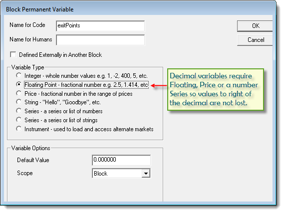 •Open the Blox Editor and click on the Entry Orders script section and select the New menu item to create a new Block Permanent Variable (BPV) Floating Point type variable: