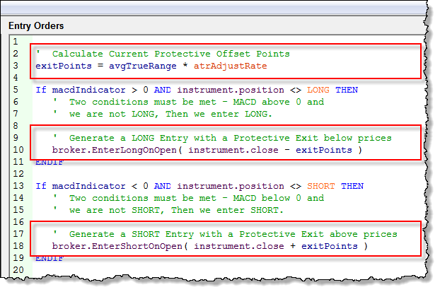 All the parameters, variables and indicator details we need to add a protective price to our entry orders are in place. To make them work we just need to add two additional lines of programming code, and modify our two Broker functions so the orders are generated with a protective price for the price bar of entry.