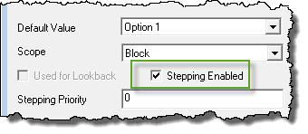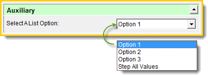 In operation, the user selects one of the options from a drop-down list of option names. Selector Parameter Options can be stepped when the Step All option enabled when it is enabled. Each text option item is created by the user using the New Parameter dialog. The user created text-names for each option will be are available at the parameter section location on the Main screen. Text can be any name that begins with a character, but each option name can only exist once in the Blox, but it can exist in other Blox as long the scope is set to Blox. |