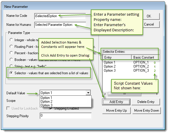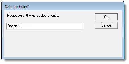 Selector is a variable option parameter setting. In use it provides a drop list of descriptive words that can selected as a list for a parameter. Option selected determines the value of the parameter. When the list is created, the first option name at the top of the list is assigned the value of zero. Second option name is assigned the value of 2. Each remaining option name will be assigned the next available integer value by their display sequence until all options are assigned a value. Option name display order is adjustable during parameter creation or editing using the Move Up or Move Down button controls below the option listing area.
