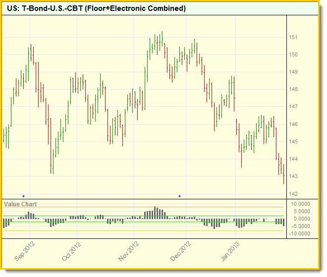 Volatility adjusted overbought/oversold oscillator. Value chart levels between -4 and +4 are considered “fair value”; +4 to +8 moderately overbought; -4 to -8 moderately oversold. Levels above +8 are considered significantly overbought and below -8 significantly oversold.