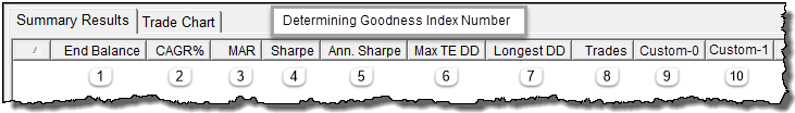 How to determine the "Goodness Index" value to apply for the first eight default statistical measure will always be the same as shown in the image above. To use a "Custom Blox Statistic" that is added to the standard eight statistical measure, that number is determined by where it appears after the Number of Trades statistic in the Stepped Parameter Summary Performance table heading image shown above.