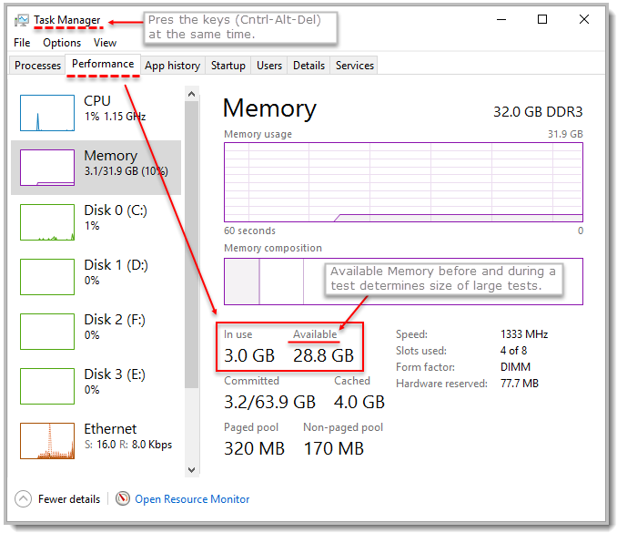 Large simulation must consider if a large test will be able to run to completion in their computer's memory. To see how much memory is available, use the Windows Task Manager Performance information to see how much memory is available before testing, and during testing if there are any concerns: