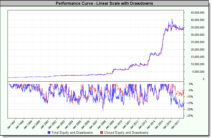 The Linear Equity Graph shows the total and closed equity profile over time measured on a linear scale with the comparative drawdowns over the same period plotted below that graph: