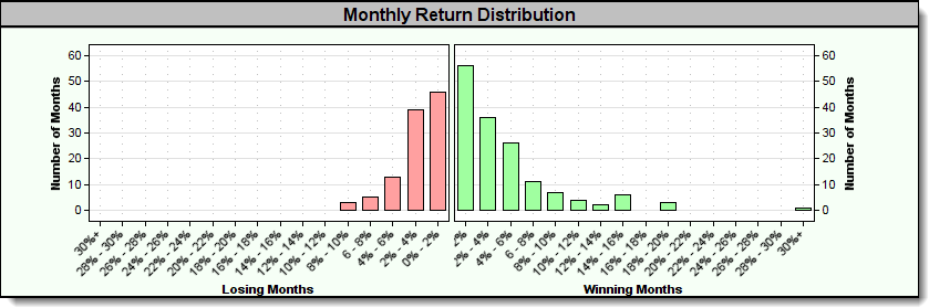 The Monthly Return Distribution graph shows the frequency distribution of the returns. Each bar shows the number of times that the monthly returns fall within a specified range. In the above example, you can see that there were 10 months where the returns were between 8% and 9%.