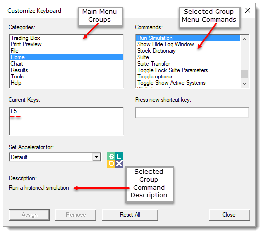 In the Tool Bar Control Editor Trading Blox provides a Keyboard Shortcuts Editor where you can assigning keyboard commands to the various menu options. Quick Access toolbar will also respond to its displayed number when the keyboard's "Alt" button is pressed. |