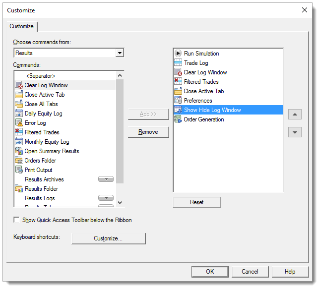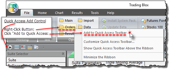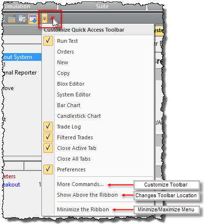 Quick Access Tool Bar can be customized to have more, or less quick access controls. This Tool Bar can also be moved from its default position below the main menu ribbon and tab controls, to Trading Blox Title Bar area. It also has a control arrow that will hide the main ribbon and provide access to the Quick Access Customization settings"