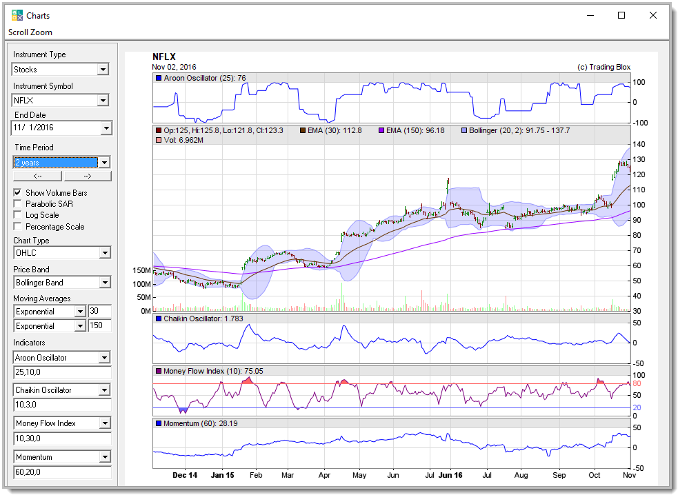Note: These indicators are all computed by the third party charting package and are for visual reference only. They are not necessarily computed the same way as the indicators in the Trading Blox Systems. |