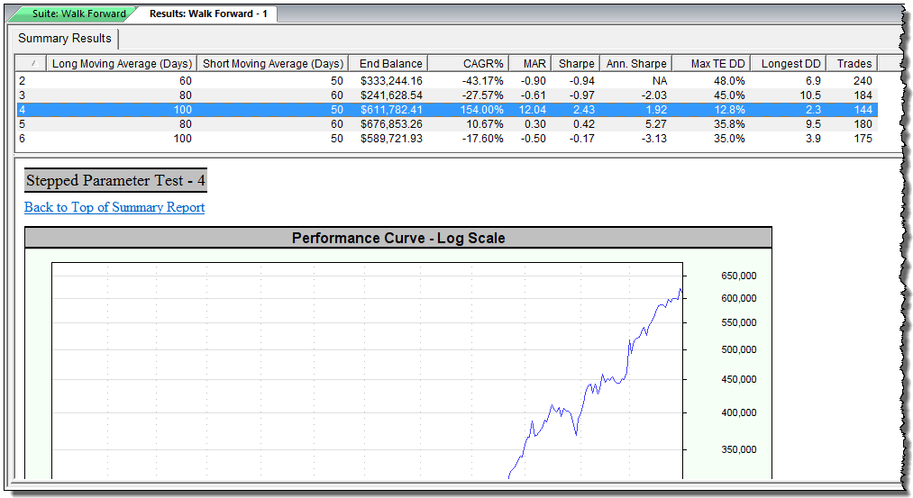 In our Walk Forward test example will will use the MAR statistic as the basis for selecting the best parameter values.