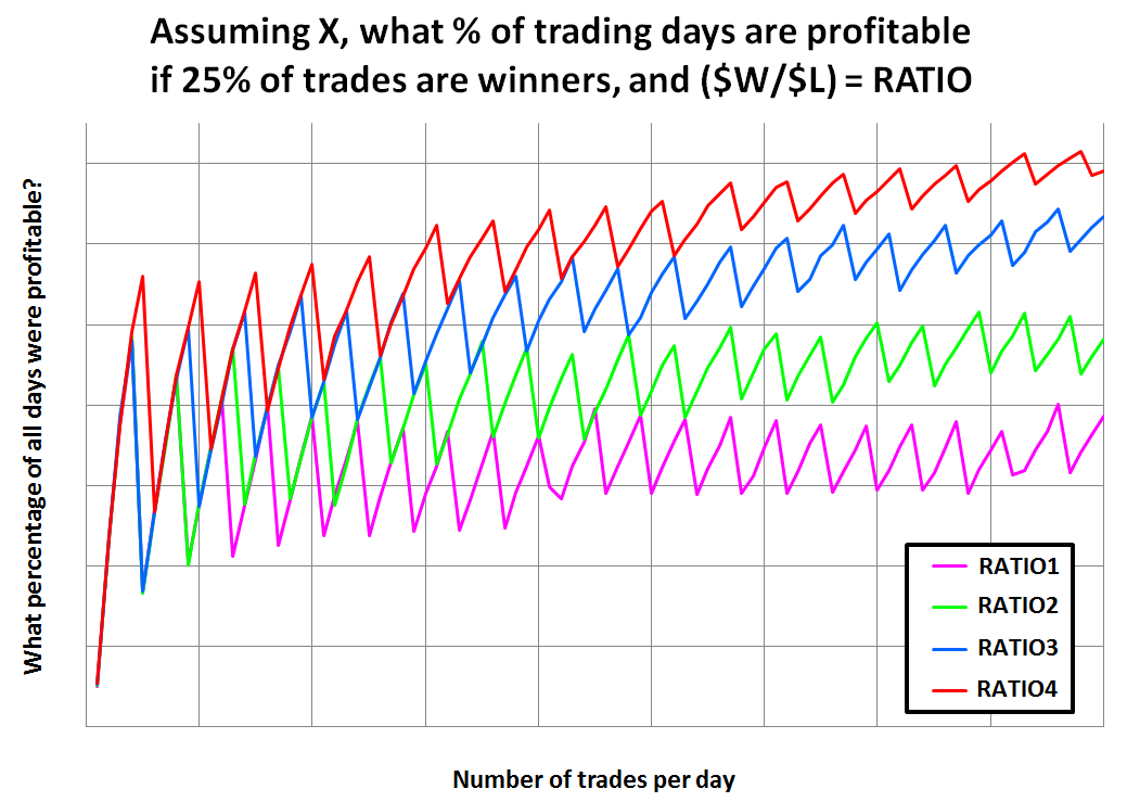 The results are shown below. As you would expect, all curves start at 25% of days profitable, because at one trade per day and 25% winning trades, it must be true that 25% of days are profitable. 25% of TRADES are profitable, and trades are the same thing as days when T=1 trade per day.