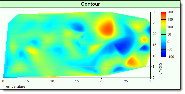 Contour maps display the X-Axis scale below the plotting areas lower chart boundary. Y-Axis scale is displayed just outside the plot areas right side boundary. Z-Axis scale steps are displayed in the area between the outside boundary Y-Axis scale. White space on the right side of a contour chart needs to provide enough pixel space to enable the Z-Scale color legend to display so that it doesn't interfere with the Y-Scale display.