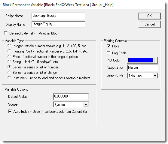 All data elements in a Numeric series are a Floating Point variables. A series, also know as an array, are an indexed list of numeric value locations that can hold the same value, or a different a value in each of the series elements. Auto-Index Series match the instrument's date information and use the same index offset that the instrument's data use. i.e., an instrument.close[0], represents the current close price. An instrument.close[1] represents the previous date's close price. That same offset number process is how the information can be accessed in an Auto-Index numeric series.