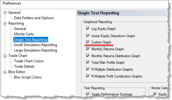 Be sure to enable the Custom Graph check-box in the Preferences' Single Test Reporting section. See the Trading Blox Builder User's Guide manual Reporting Information's Graphical Reporting topic for more information.