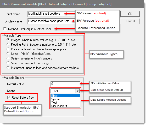 All BPV variables are accessible to all the block script sections in a block. That access can be increased to other blocks when the scope setting for a BPV variable selects a scope value that is not Block. BPV variables work faster than script-section created Local Variables. BPV variables initialize to the established default value that was entered when the BPV variable was created. BPV Initialization happens in the Before Test script section at the beginning of a test.