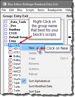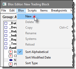 A new block can be created by clicking on the Blox menu option in the Blox Basic Editor and selecting New. A second method is to right click on a Group name and select the New option from the popup menu.