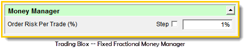This order sizing method is favored by professional because it allows the trader to determine the percentage of risk each position is allowed to use. Percentage in this case is determined by the "Risk Per Trade (%) value entered into the Blox parameter field. A value of 1% is the rate used to determine how much of the account's equity can be made available to the order.