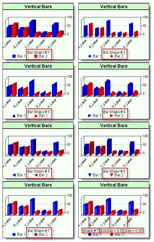 This Image is a collection of column chart images showing the various shapes. It also shows the Gap and Subgap locations where their size changes the bar spacing: |