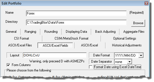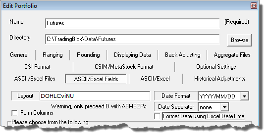 When an UnFairAdvantage instrument portfolio of symbols is created for downloading each day, the following images of UnFairAdvantage's ASCII/Excel Fields will populate the data records with the above Trading Blox data requirements. Less columns can be used when Extra-Data columns are not going to be added after the file updating has completed.